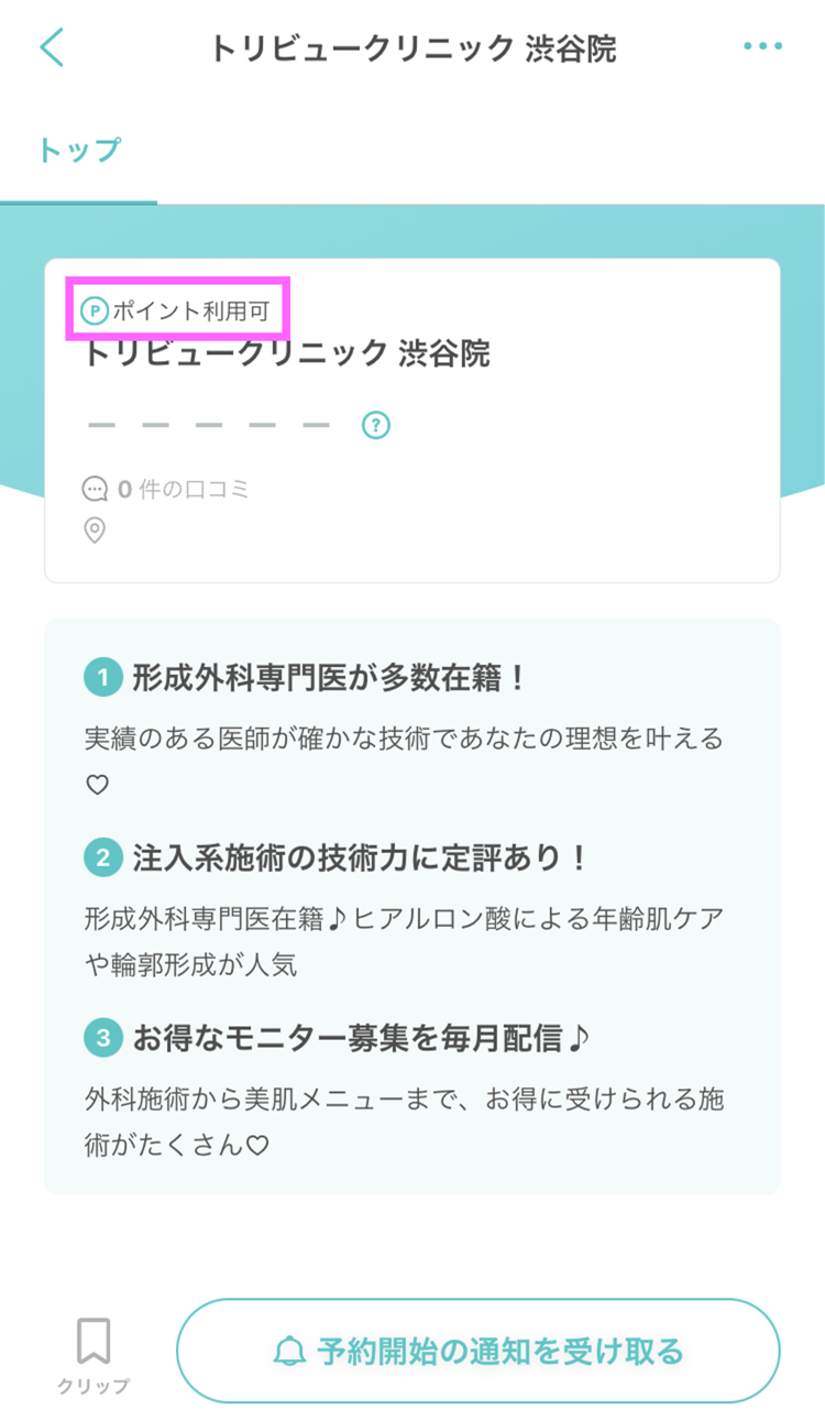 トリビューのアプリからご確認いただけます。ポイント・クーポンが利用可能な場合、クリニックページに『ポイント利用可』と表記があります。利用不可の場合には表記がありません。ご不明点がございましたら、管理画面右下のチャットよりお問い合わせください。