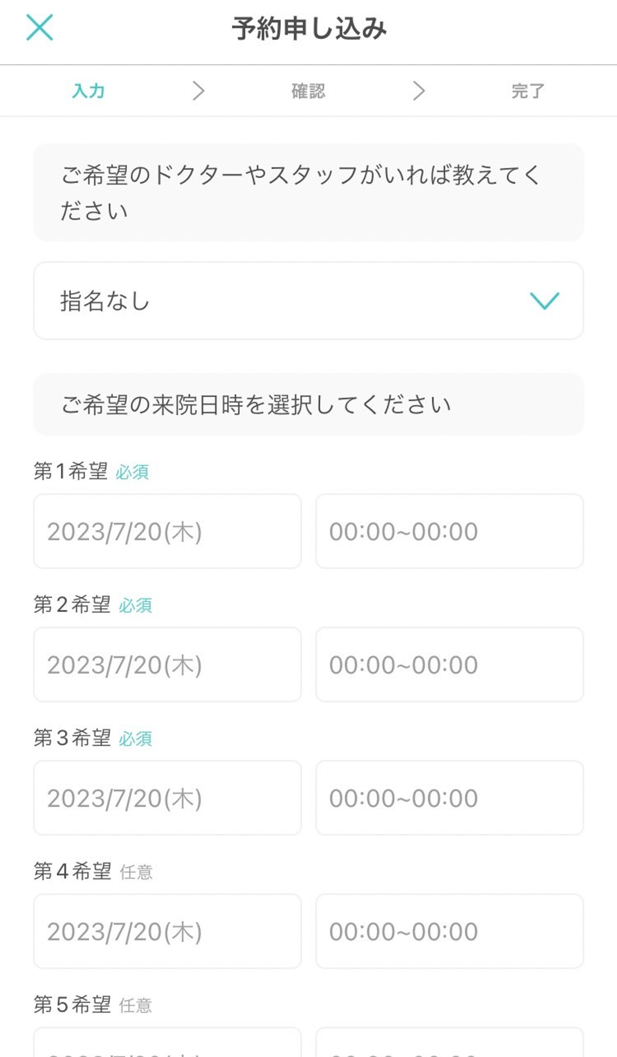 ※「相談・予約」ボタンをクリック後の予約申し込み画面
