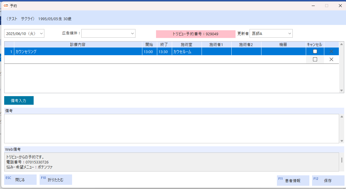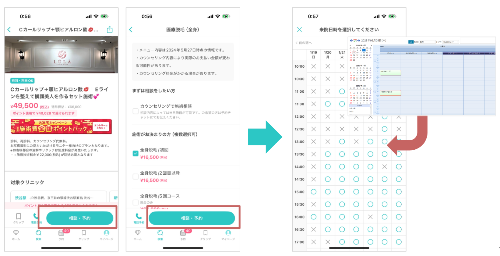 「当日施術あり」→空きの表示されないダミーメニューをアクシスにて作成し連携「当日施術なし」→カウンセリングのみメニューを紐付け