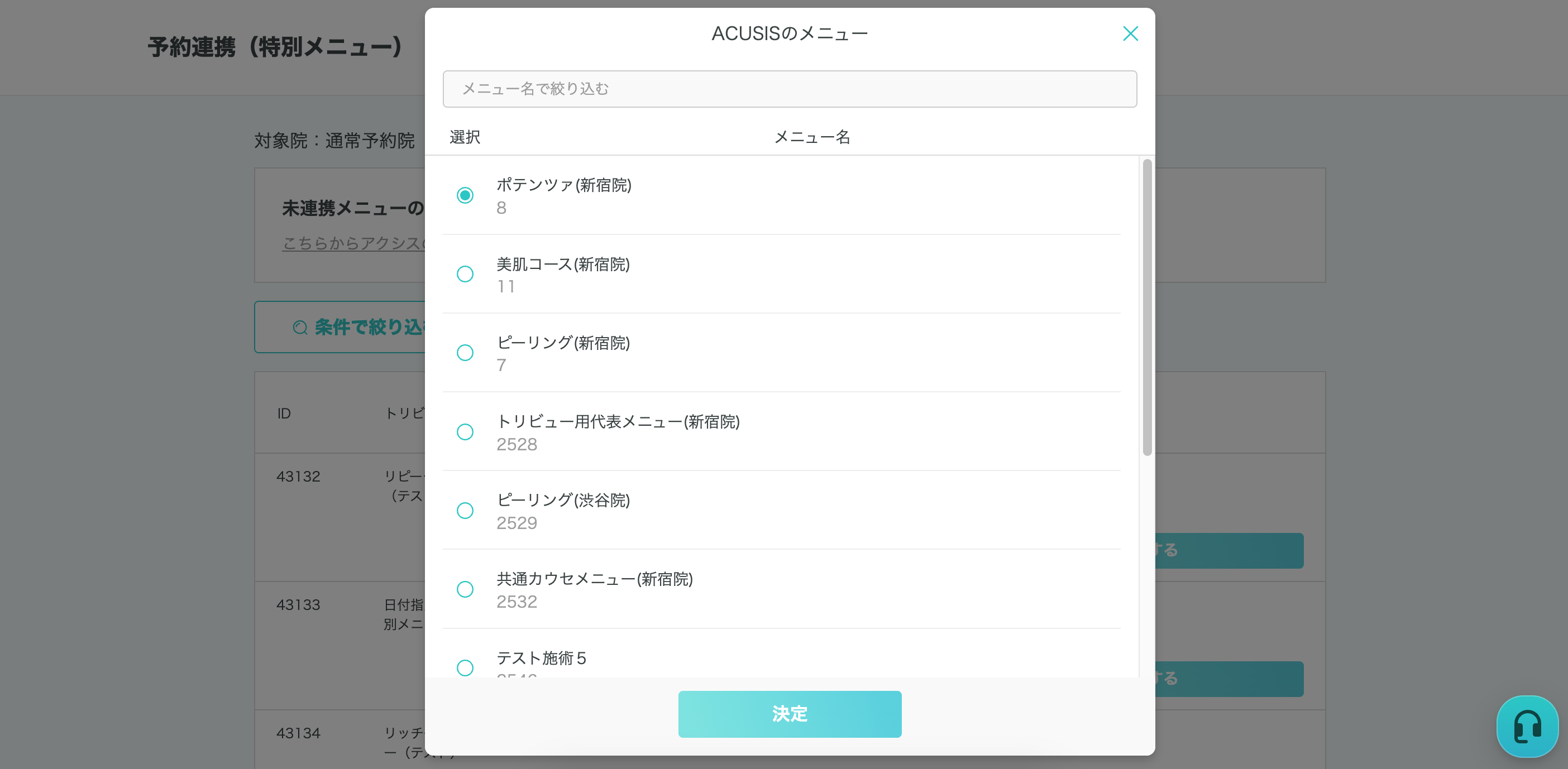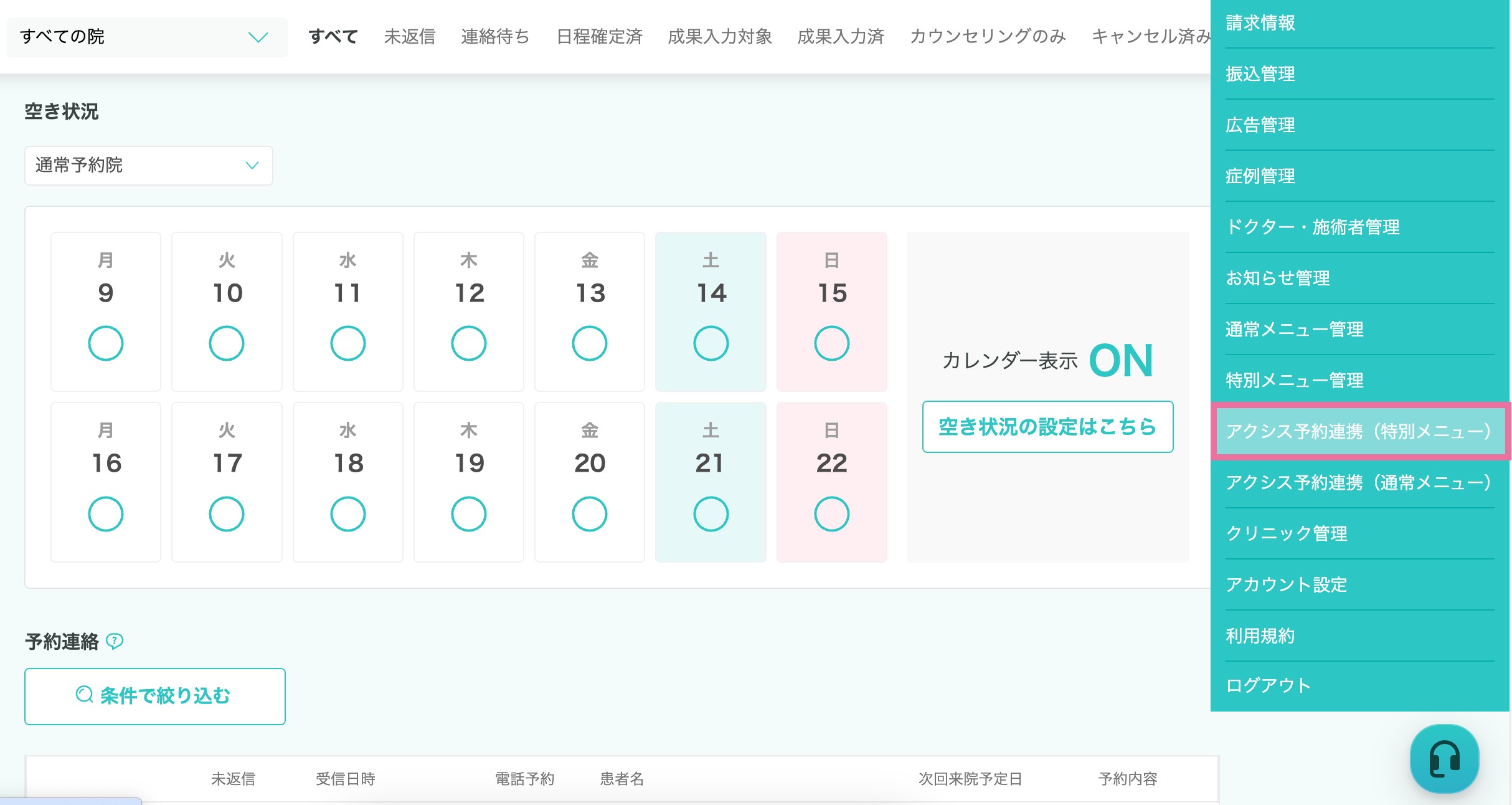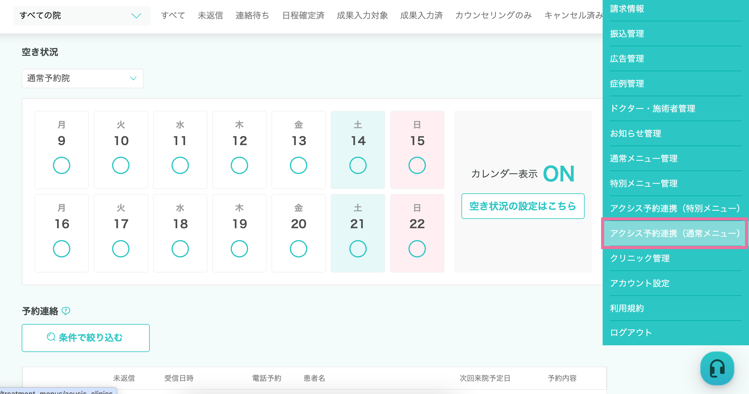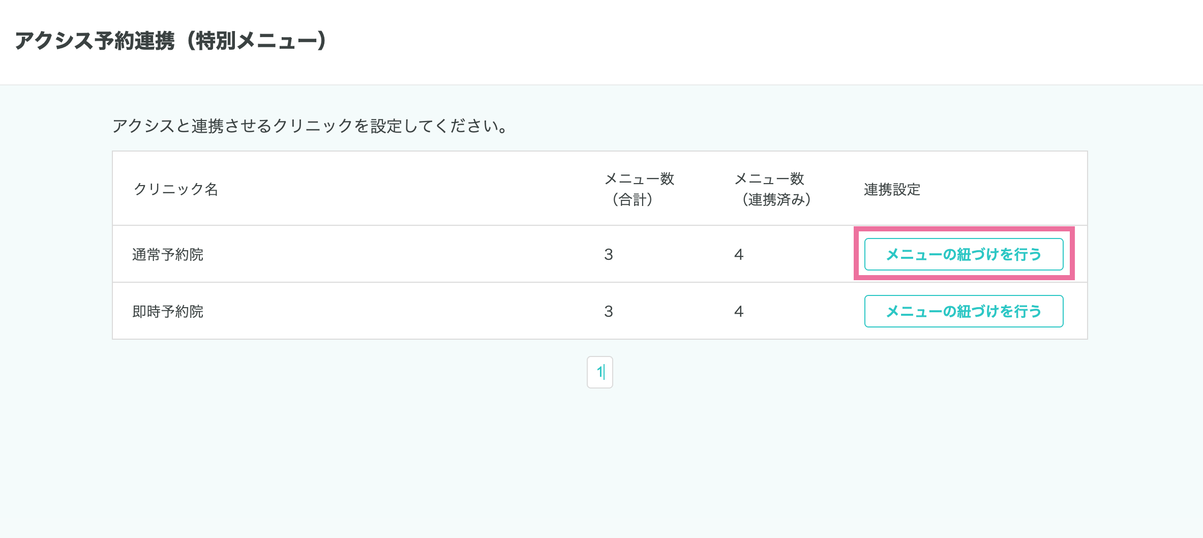※該当ページ:予約連携(特別メニュー) or 予約連携(通常メニュー) ➡︎ 院を選択