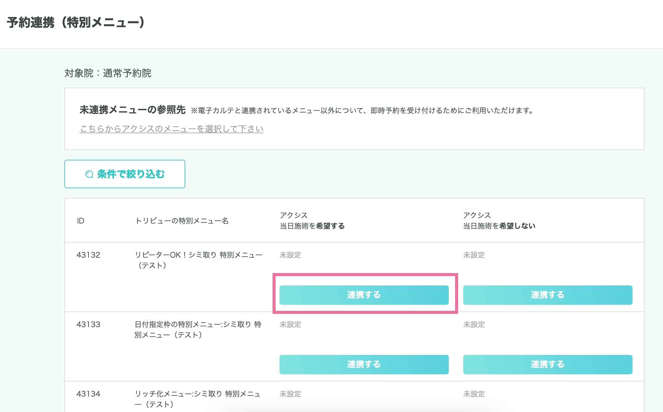 • 「当日施術あり」「当日施術なし」の両方にメニュー連携されているか
