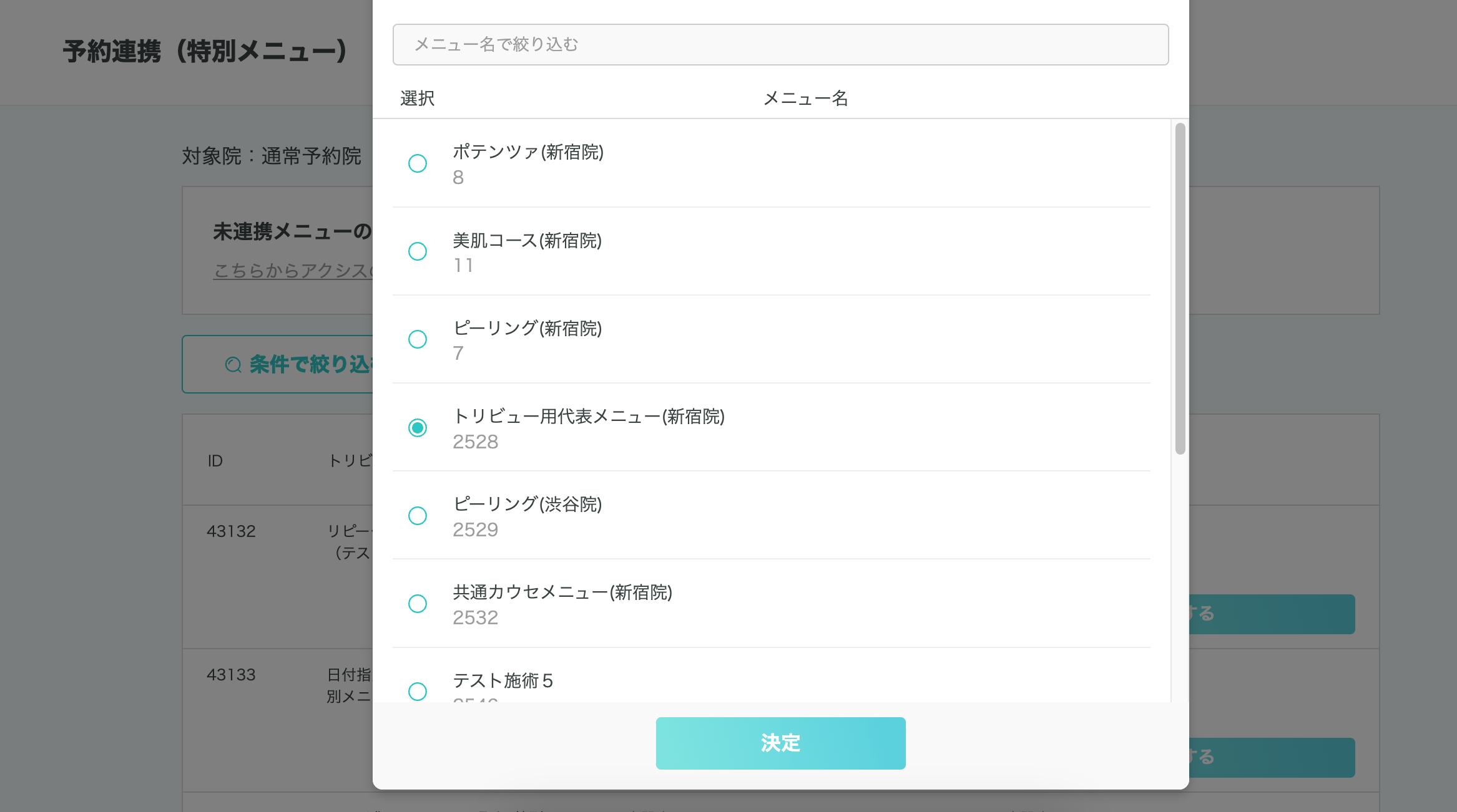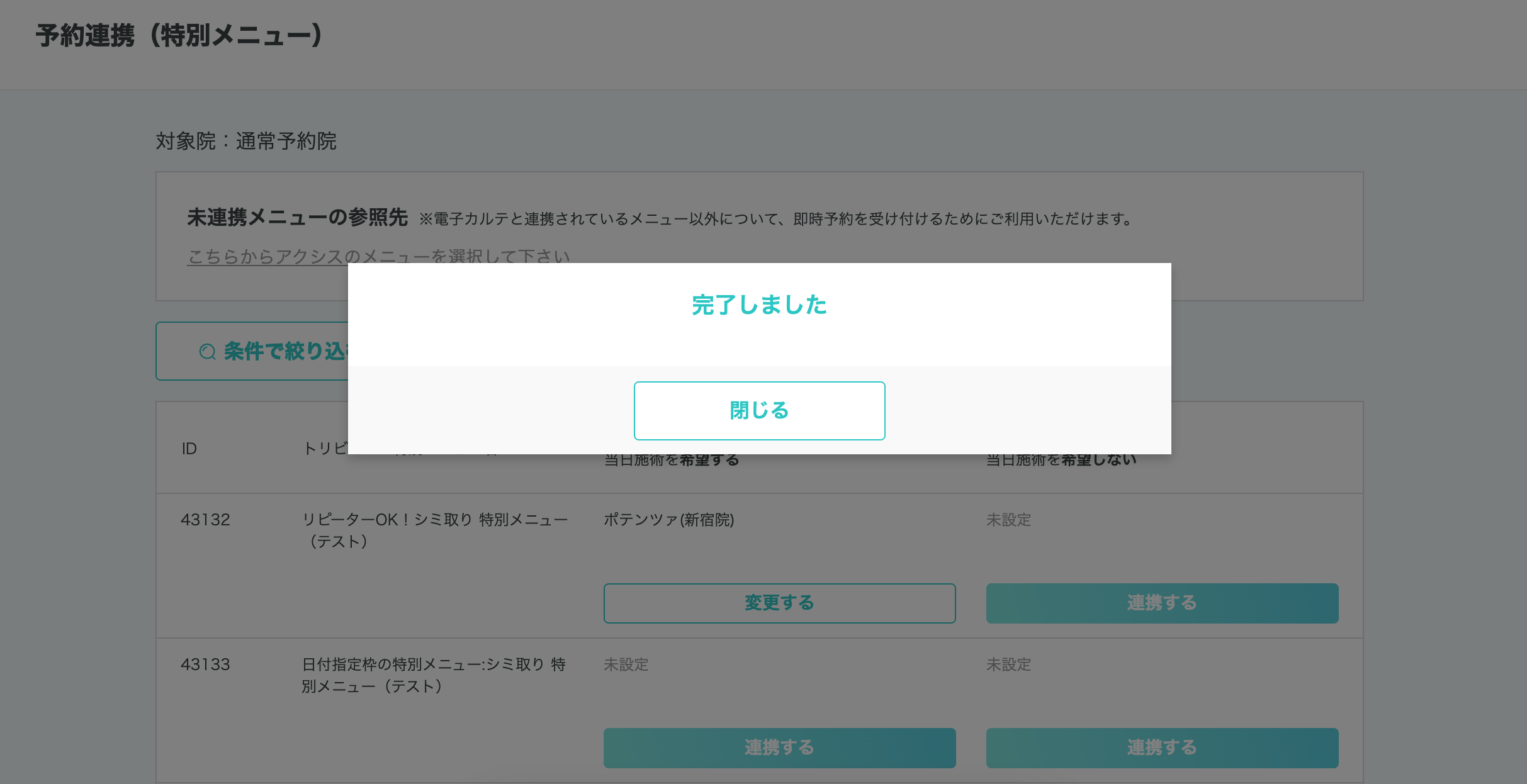 • 予約連携(特別メニュー)と予約連携(通常メニュー)のページ両方に表示がありますが、同じメニューが自動で紐付けられます ※それぞれ別メニューを設定はできません。