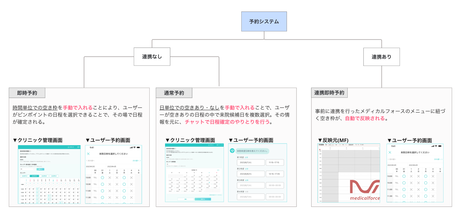 メディカルフォース予約連携機能をご利用の場合、予約の流れは主に3パターンに分類されます。