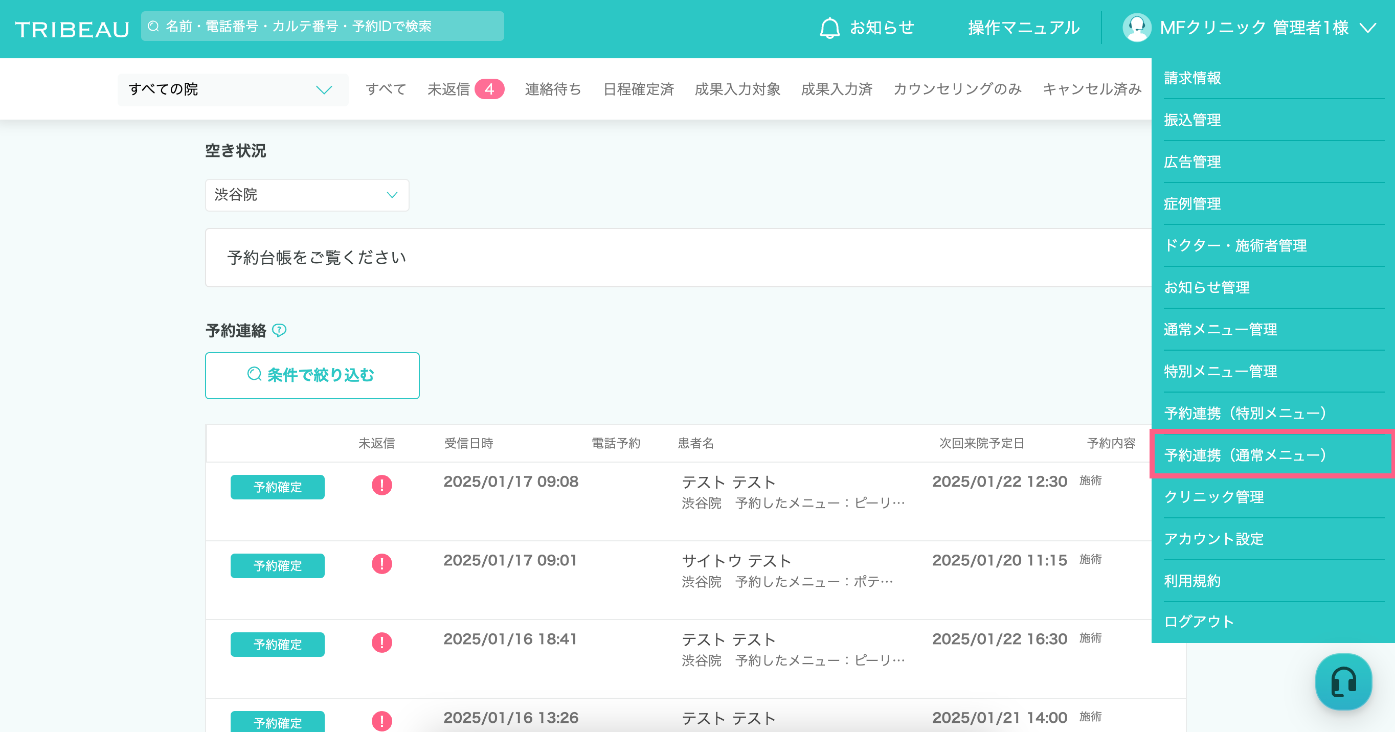 メディカルフォース連携メニューへの予約のため、メディカルフォースの管理画面をご確認ください