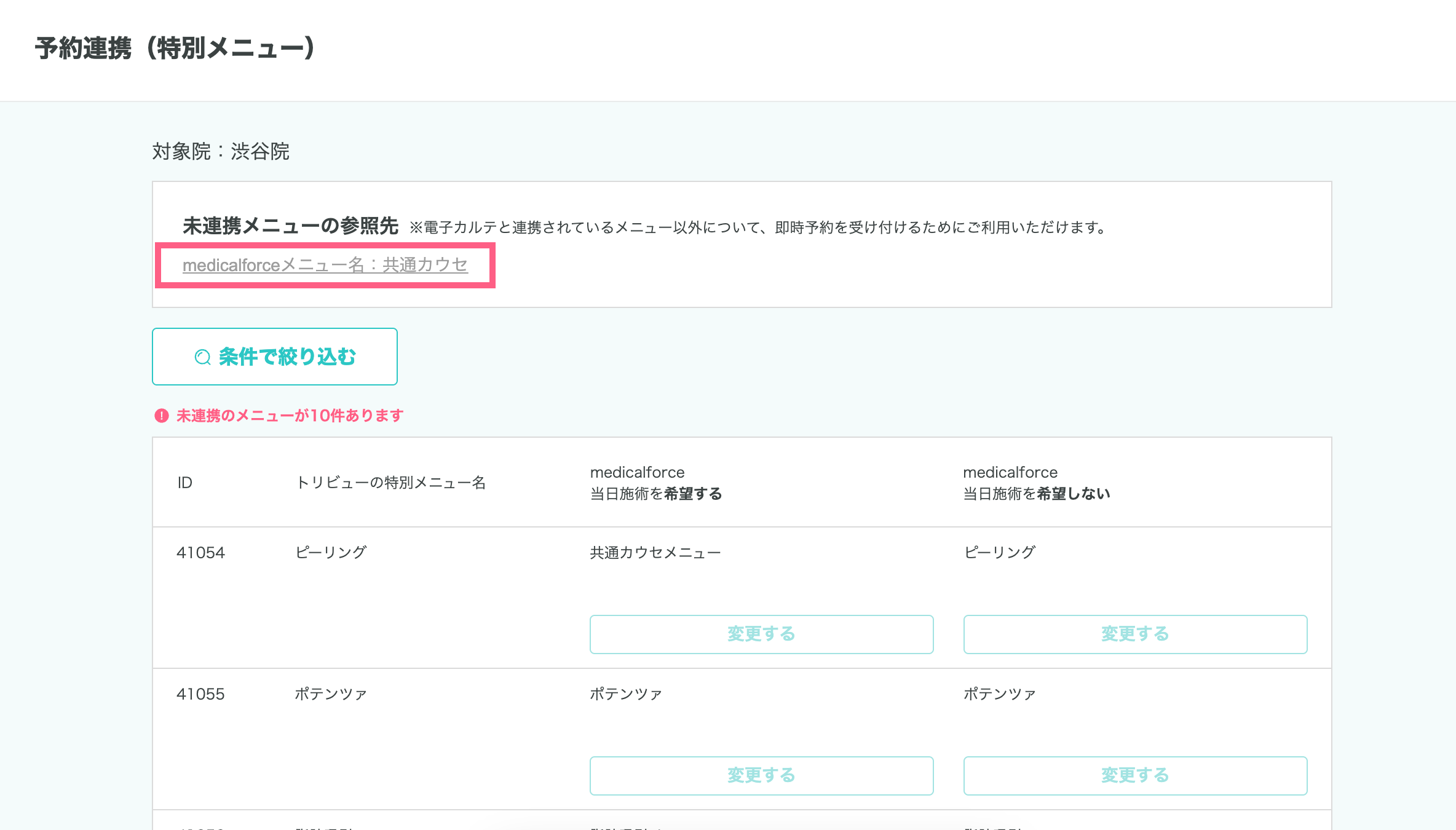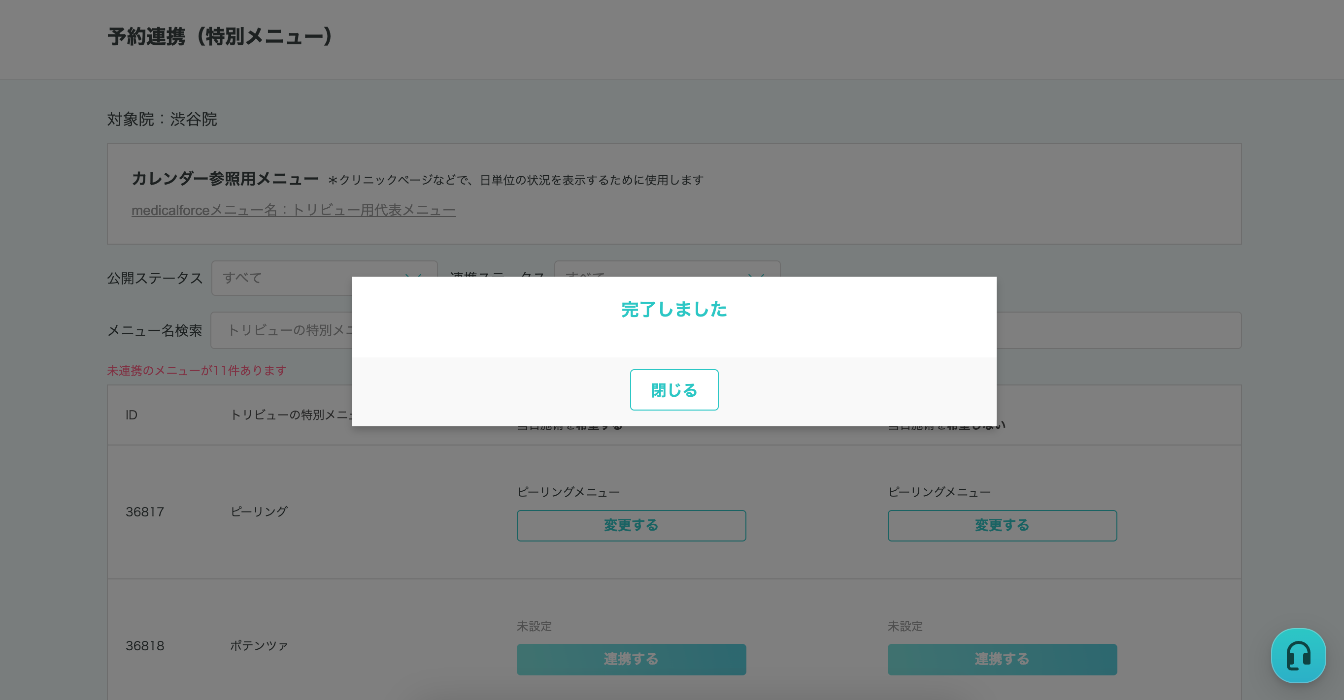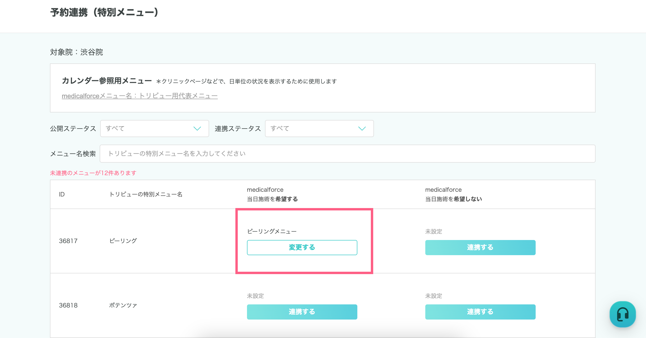 ※該当ページ:予約連携(特別メニュー) or 予約連携(通常メニュー) ➡︎ 院を選択