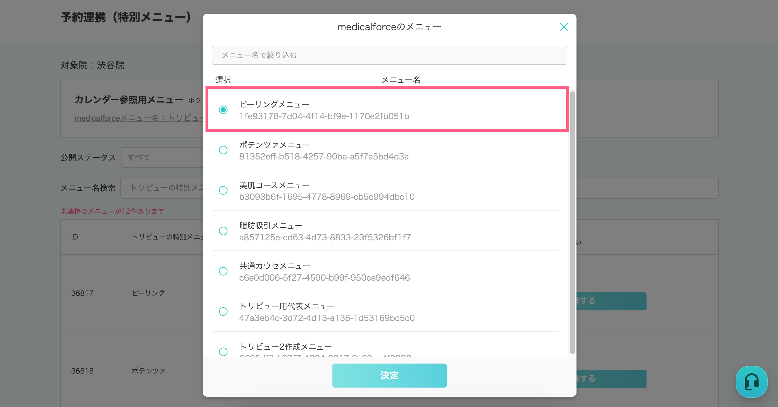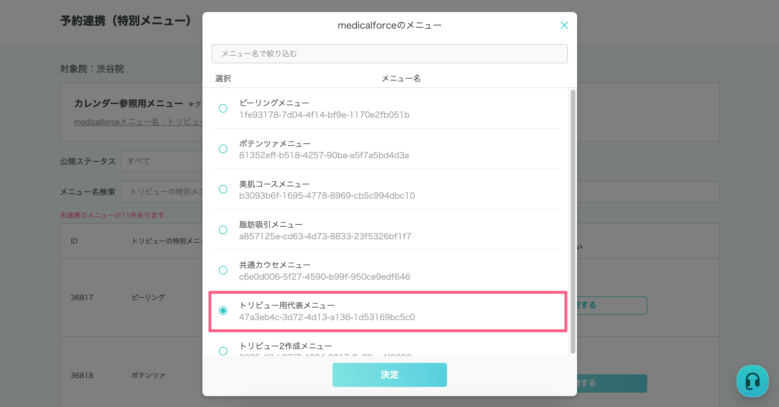 トリビューメニューごとにメディカルフォースメニューの紐付け作業が必要