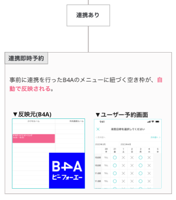 紐付けありのメニューから予約が入る場合、B4A上の空き枠で即時予約が可能。