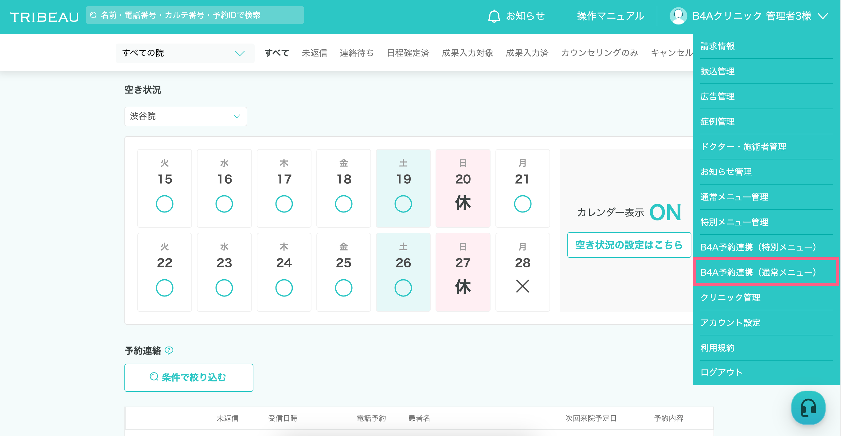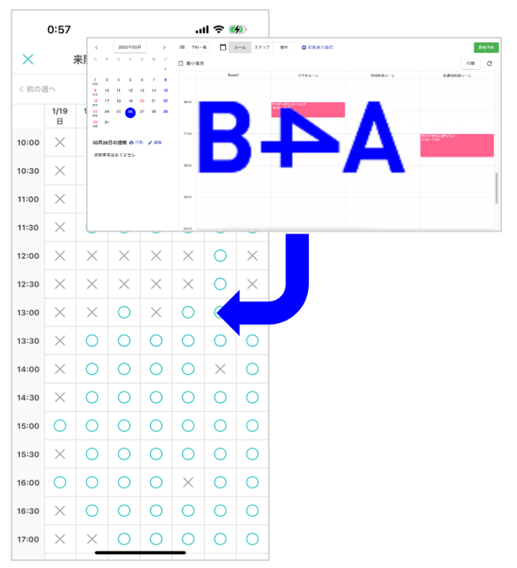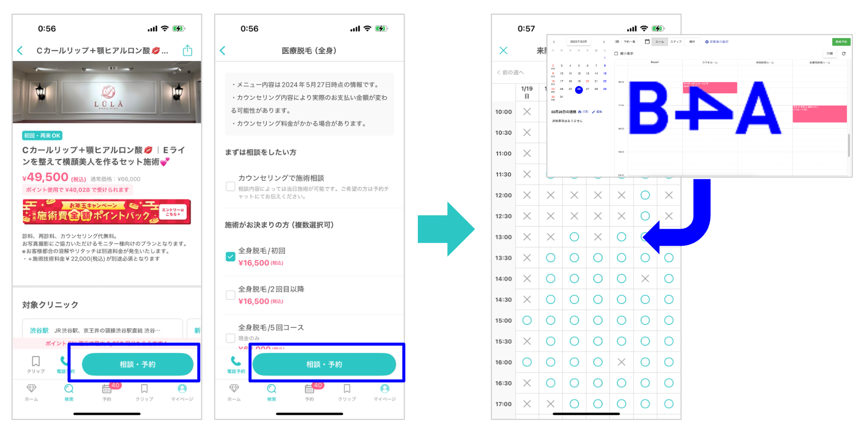 「当日施術あり」→空きの表示されないダミーメニューをB4Aにて作成し連携「当日施術なし」→カウンセリングのみメニューを紐付け