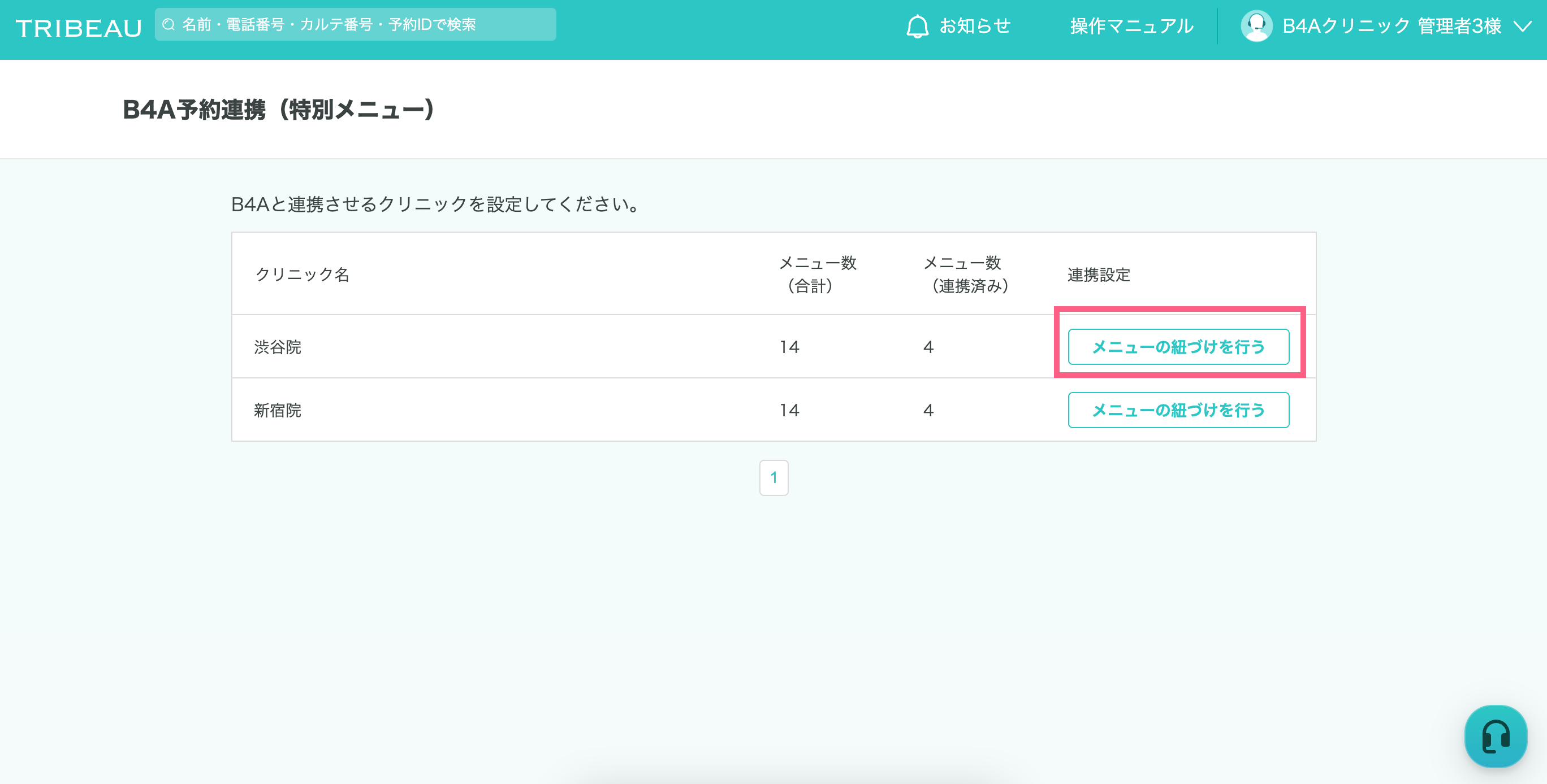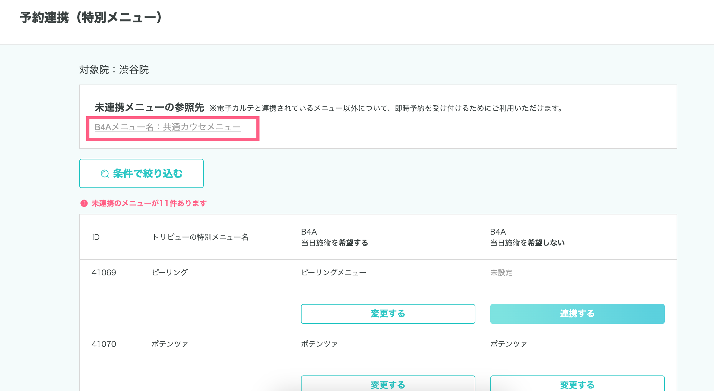 ※該当ページ:予約連携(特別メニュー) or 予約連携(通常メニュー) ➡︎ 院を選択