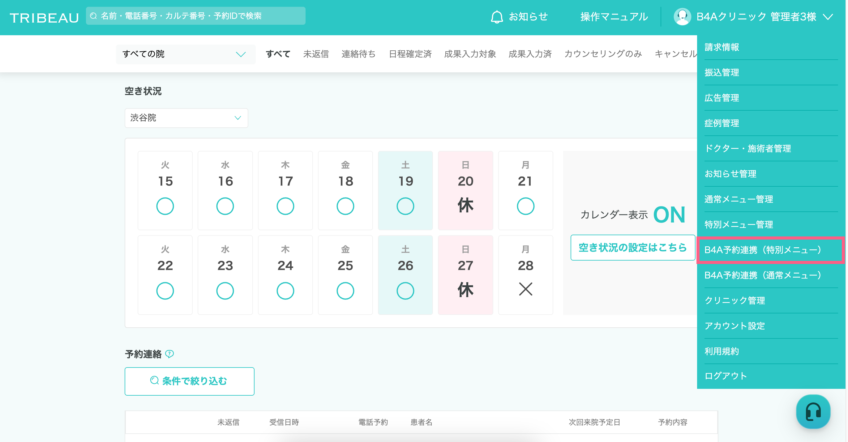 B4A連携メニューへの予約のため、B4Aの管理画面をご確認ください