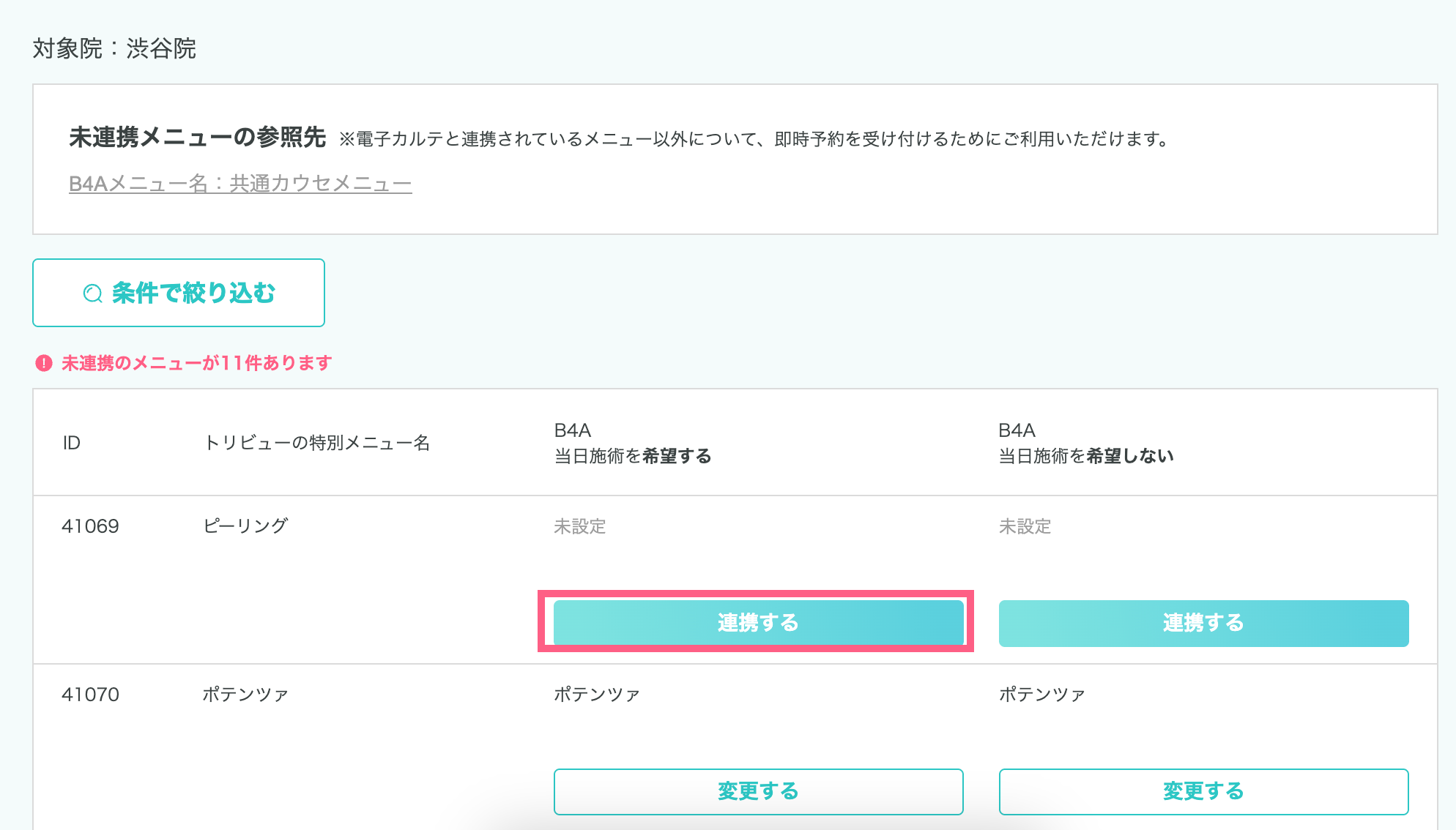 ※当日施術を希望する・しない場合それぞれで紐付け先を設定します。