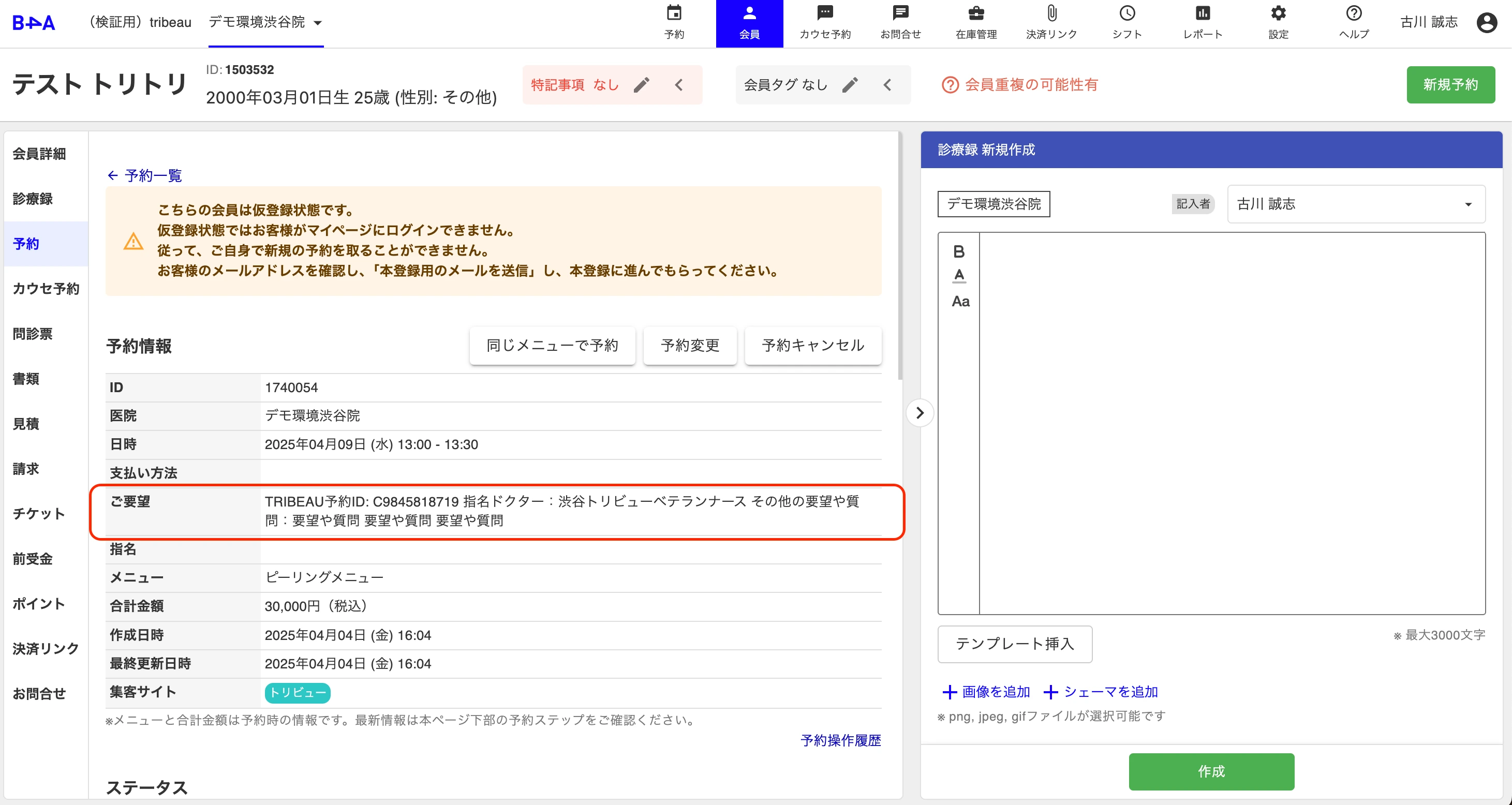 トリビューからの予約です。(TRIBEAU予約ID:000000)