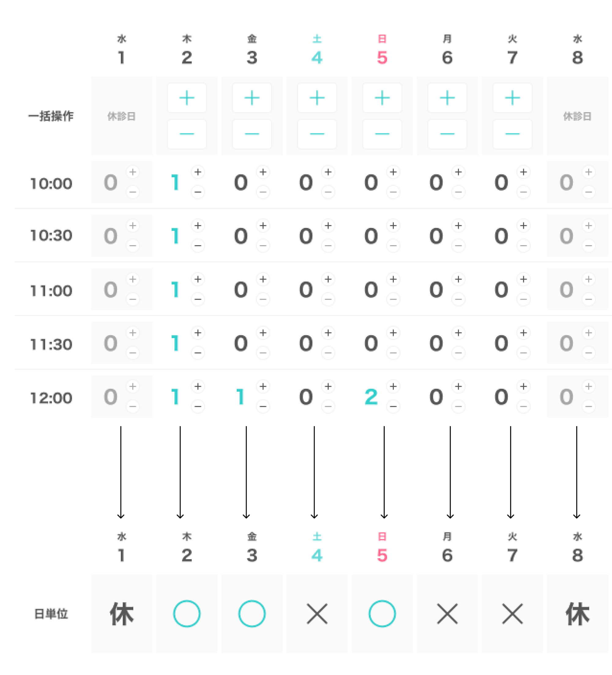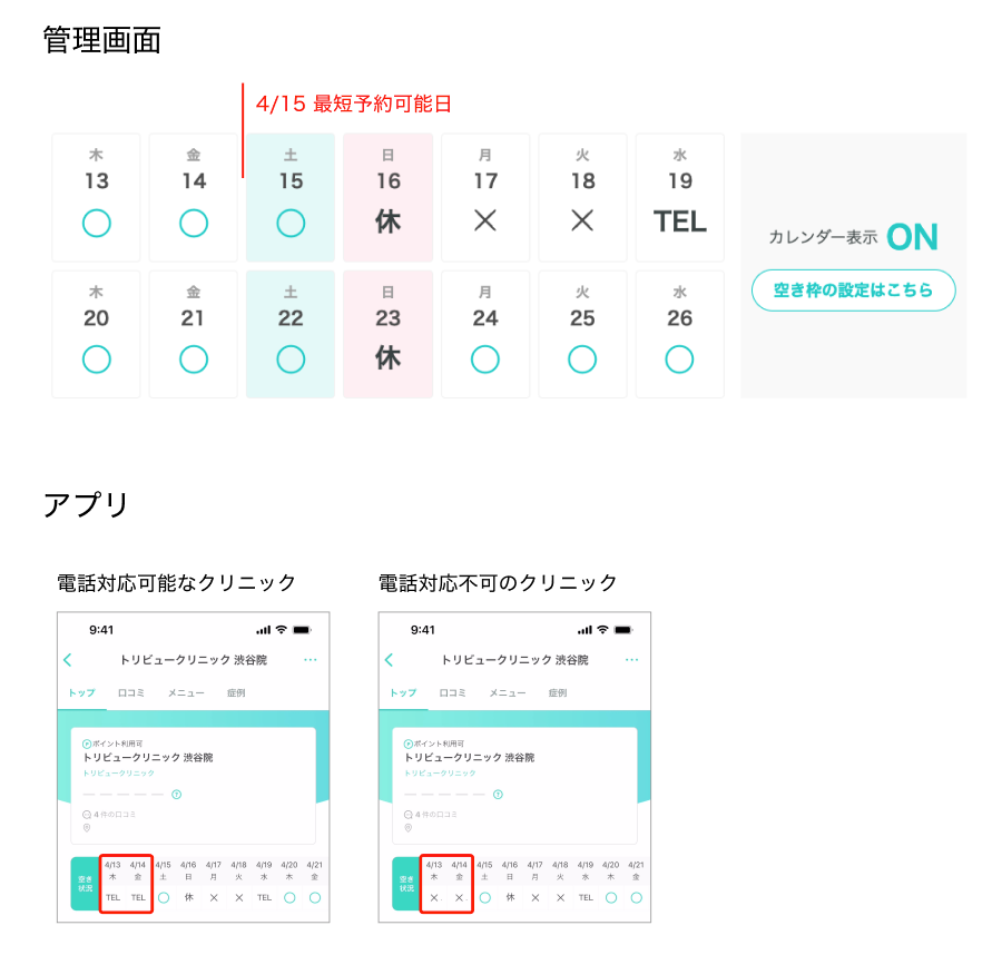 今日を基準としたとき、何日後から予約可能かを表す最短予約可能日を設定いただいています。(例:1日後、2日後など)最短予約可能日よりも前の日程で、「◯空き」が登録されている場合、アプリ上は下記表のように表示されます。