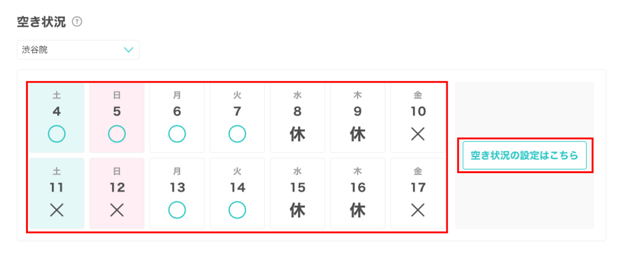 直近2週間の空き状況が表示されます。