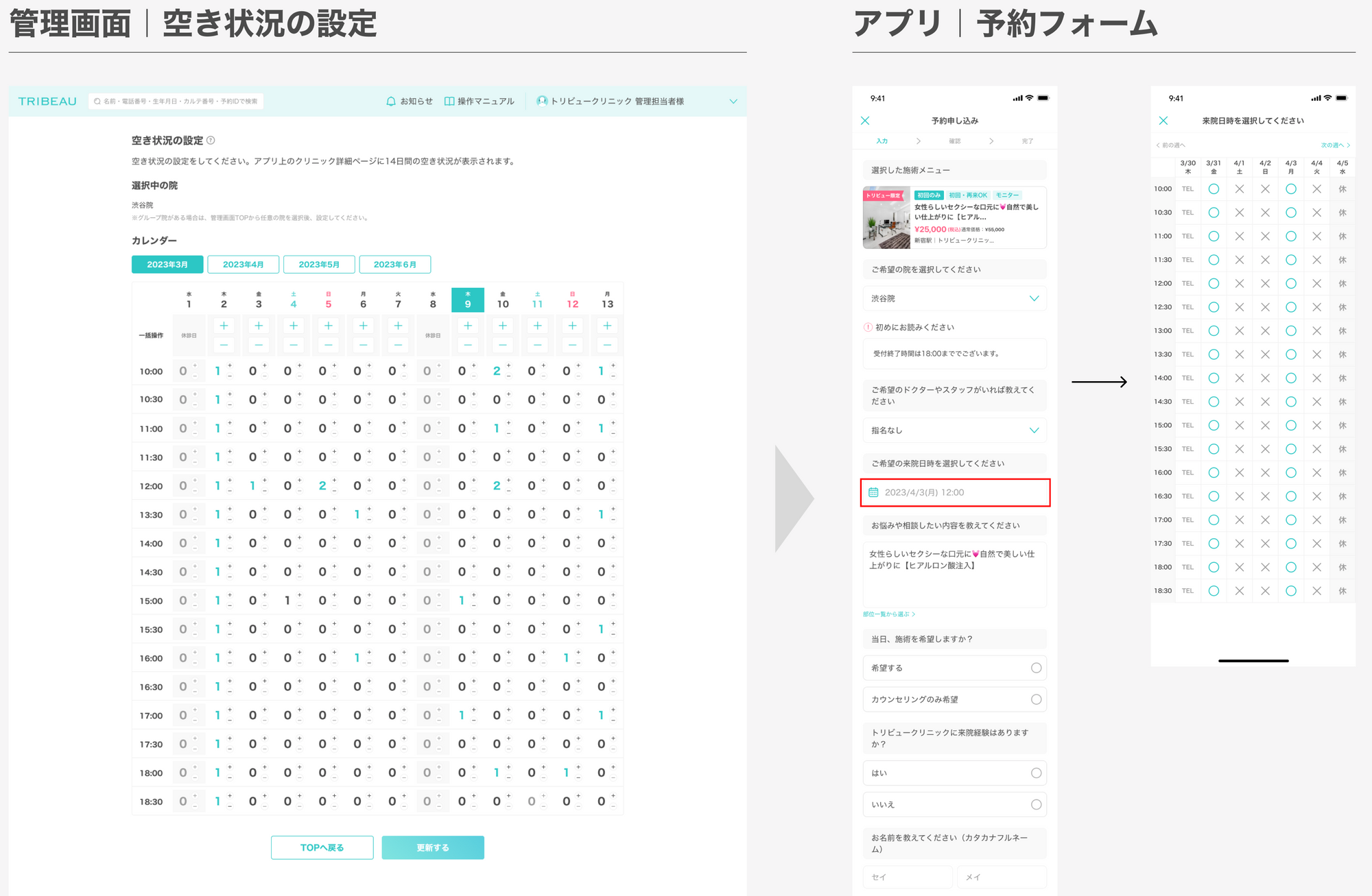 トリビュー即時予約機能はクリニック様が事前に設定した空き状況をユーザーが直接参照し、来院希望日時を選択することで予約を完結させる機能となります。