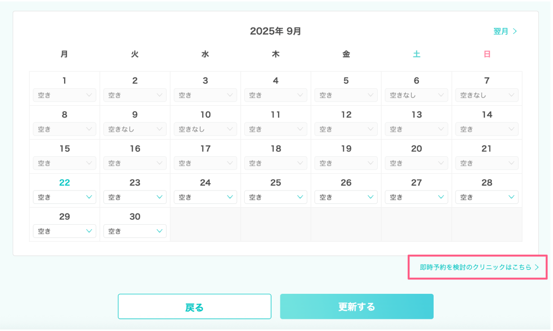 ※通常予約→即時予約への切り替えをご希望の場合は、通常予約設定用カレンダー右下の<即時予約を検討のクリニックはこちら>よりカレンダーに遷移してください