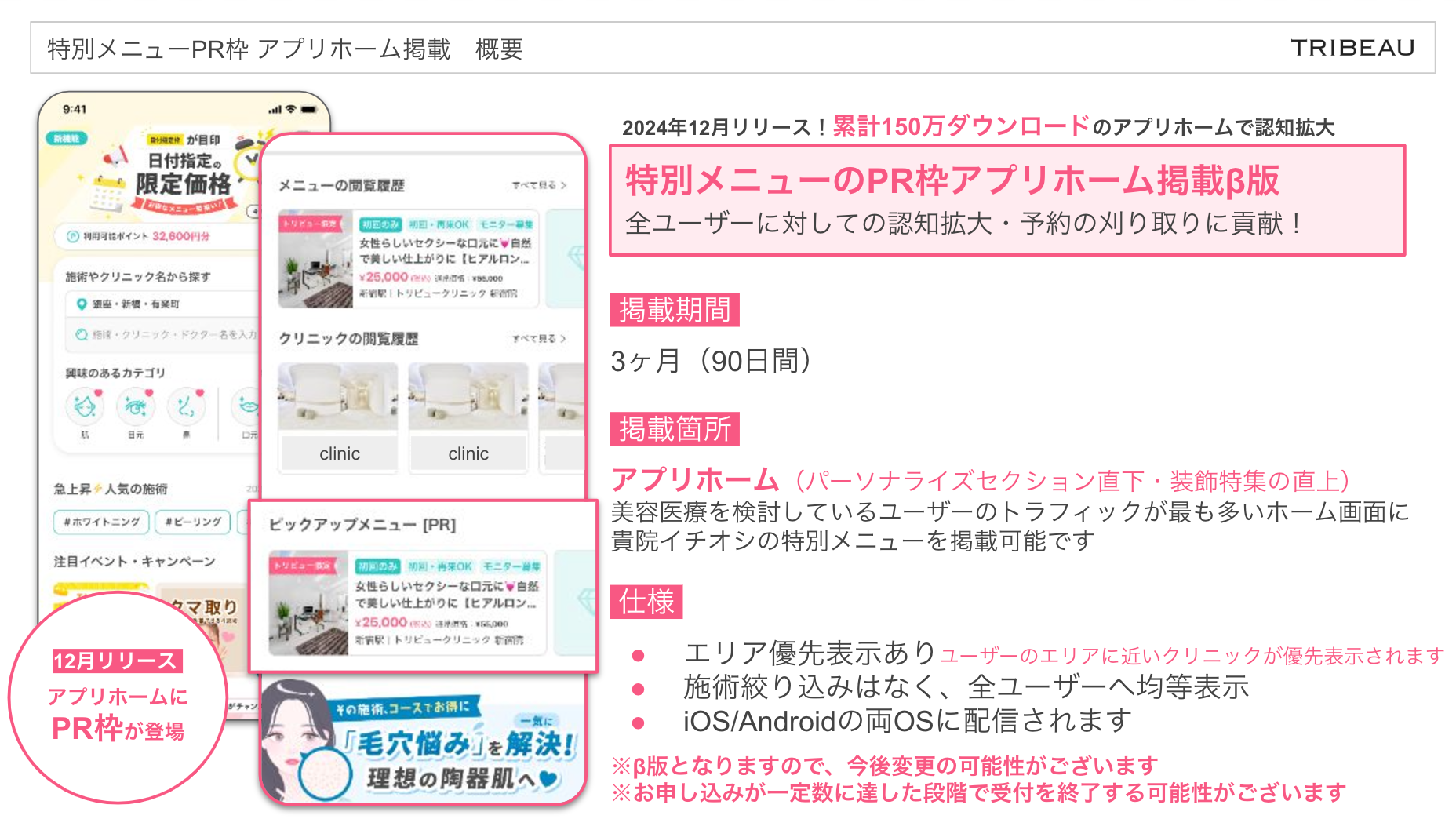 掲載中の特別メニューを「ピックアップメニュー(PR)」として、アプリホームや施術ページに優先表示させる広告商品です。