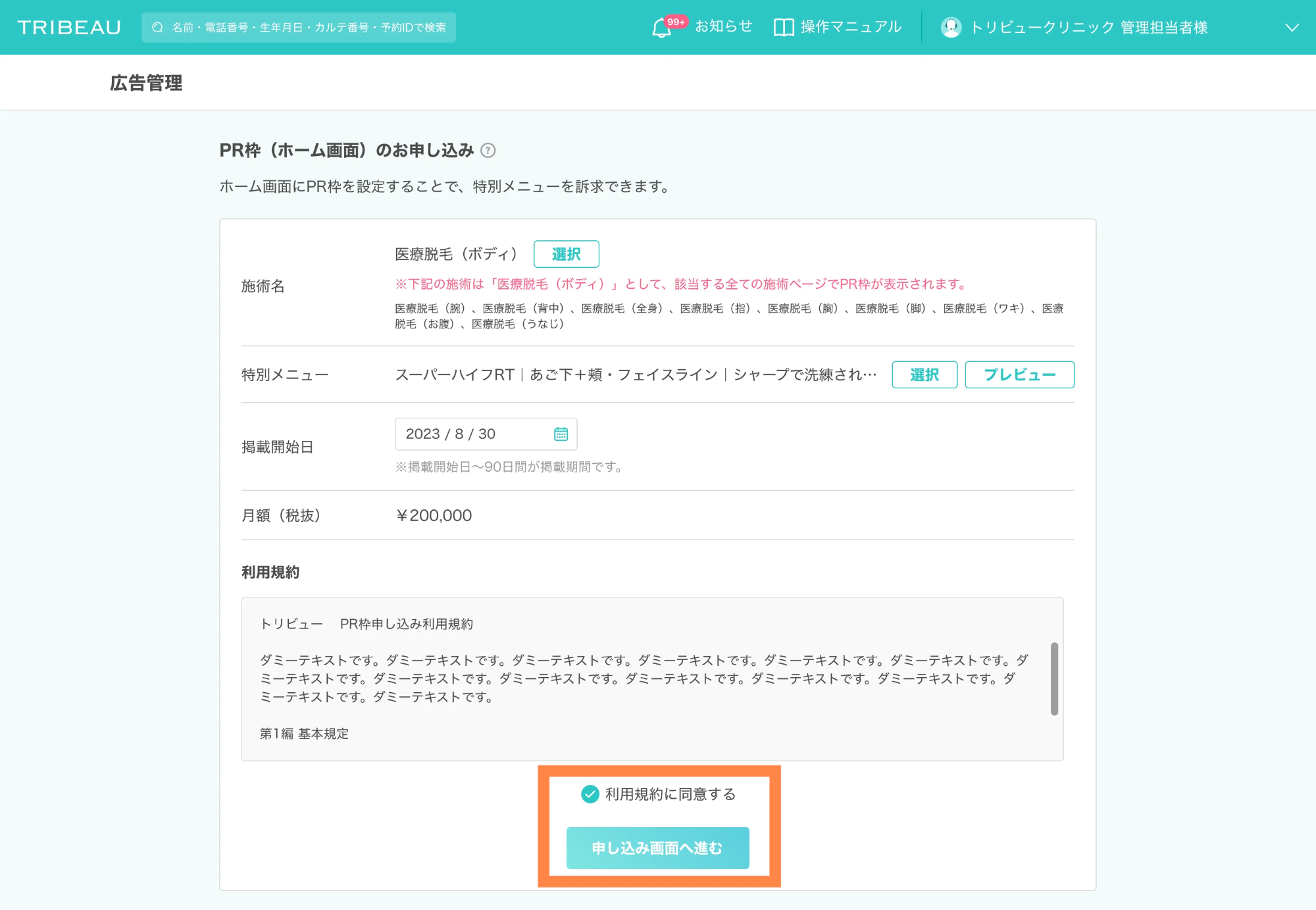 掲載開始日を設定し「利用規約に同意する」にチェックを入れて「申し込み画面へ進む」をクリック