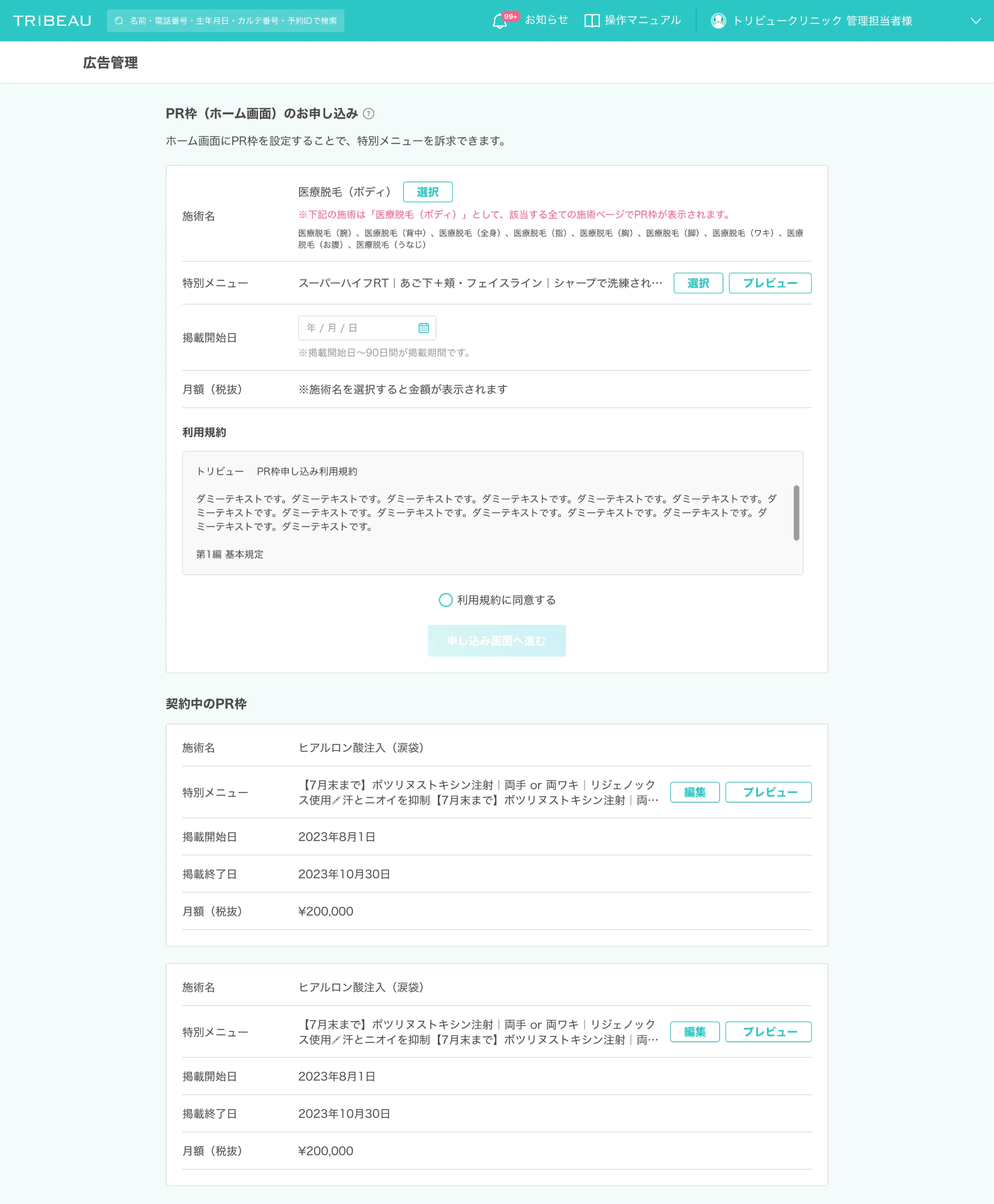 特別メニューPR枠に設定した特別メニューをクリニック側で「非公開」とした場合は、PR枠が表示されません。掲載が失われた期間についての補償・補填等はできかねます。