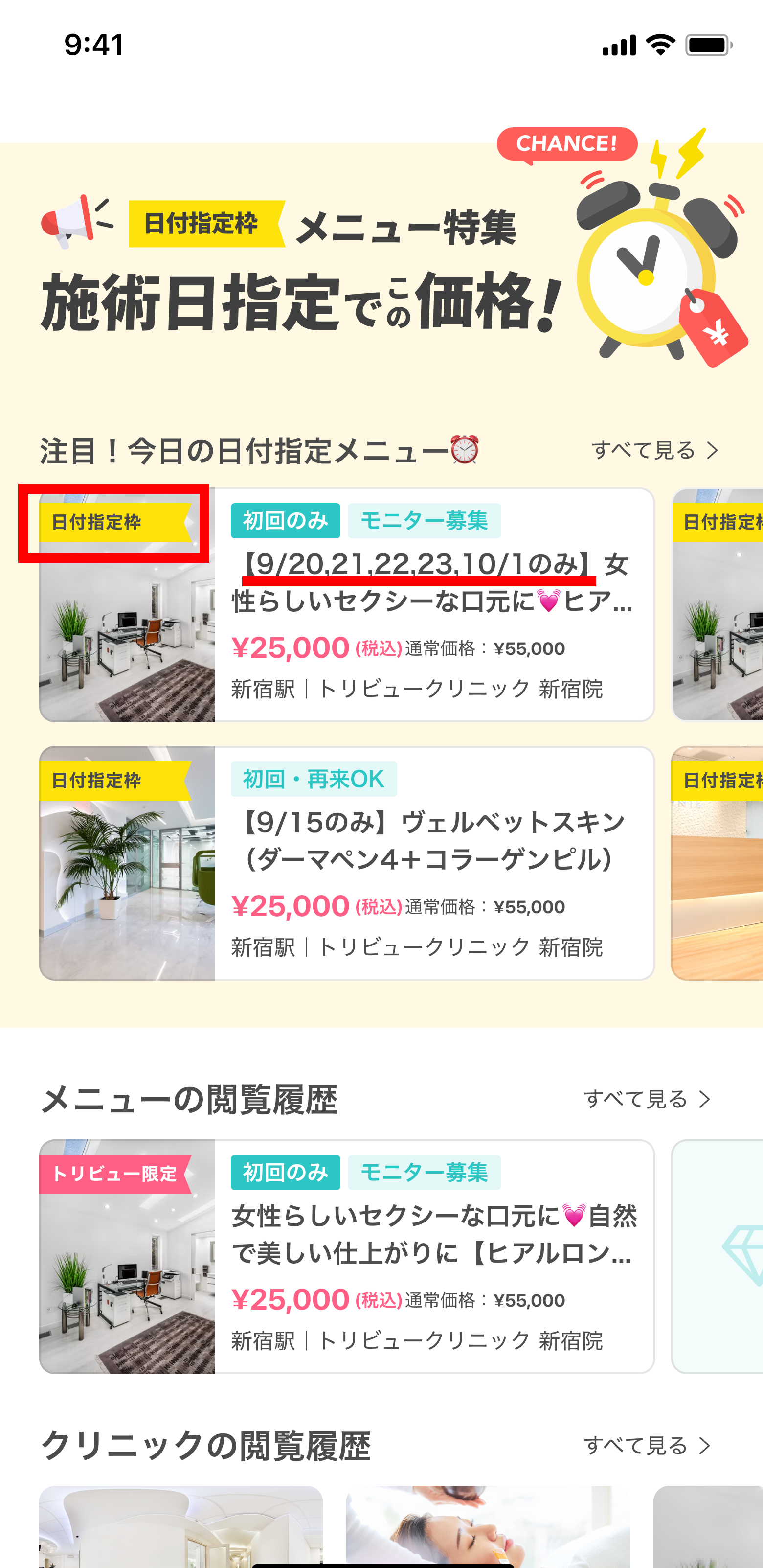 既存の特別メニューに対して施術日指定の日付指定価格を設定し、日付指定メニューとしてアプリ内に掲載することができます