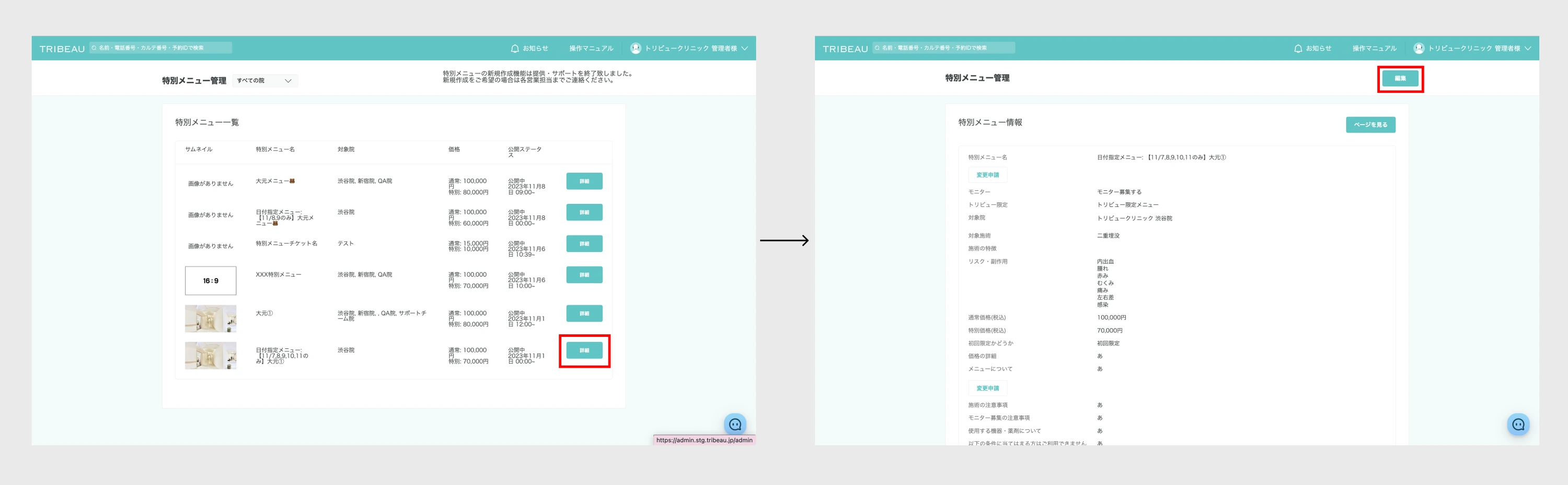 日付指定メニューの詳細画面へ遷移し、「詳細」ボタンから日付指定メニュー編集画面に遷移