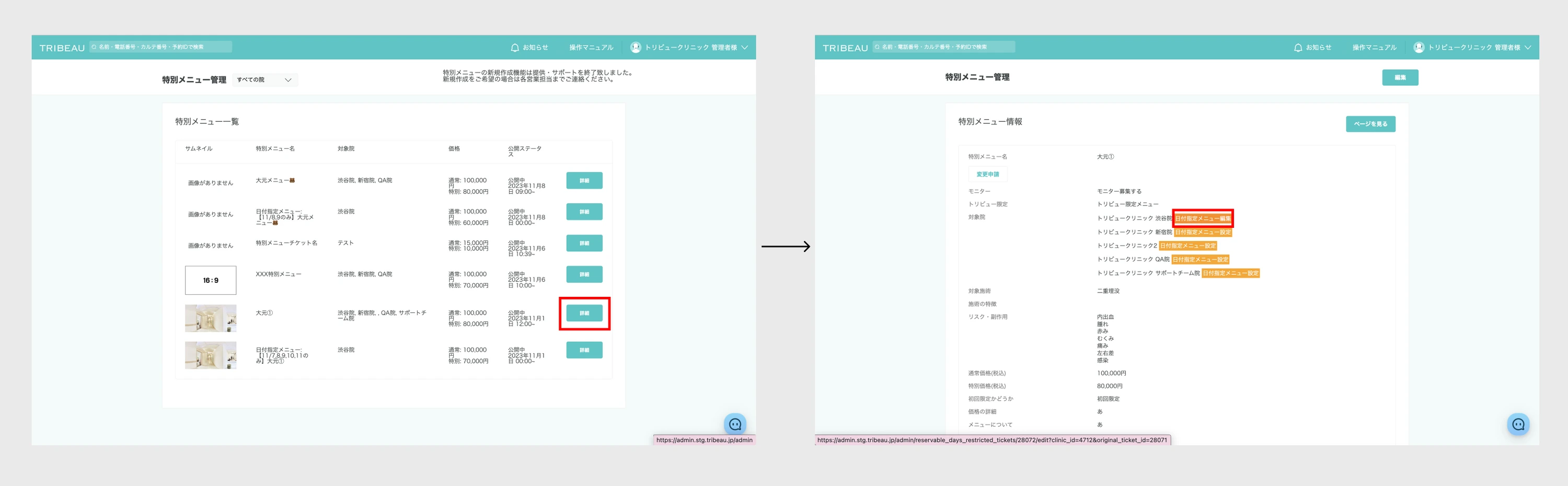 特別メニュー管理>特別メニュー一覧画面から、日付指定メニュー元としたい特別メニューの詳細画面へ遷移