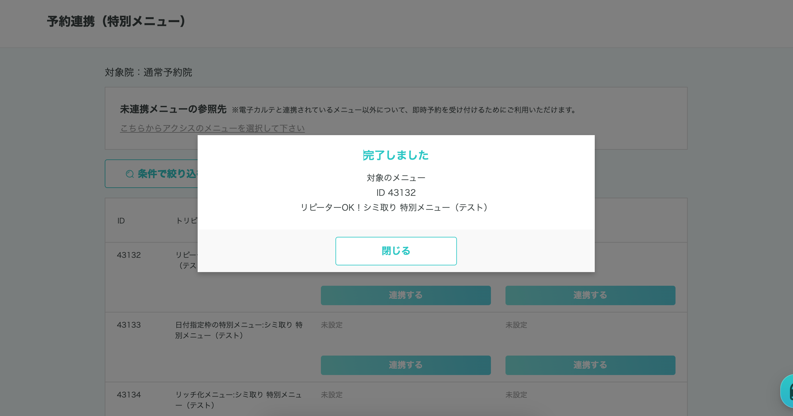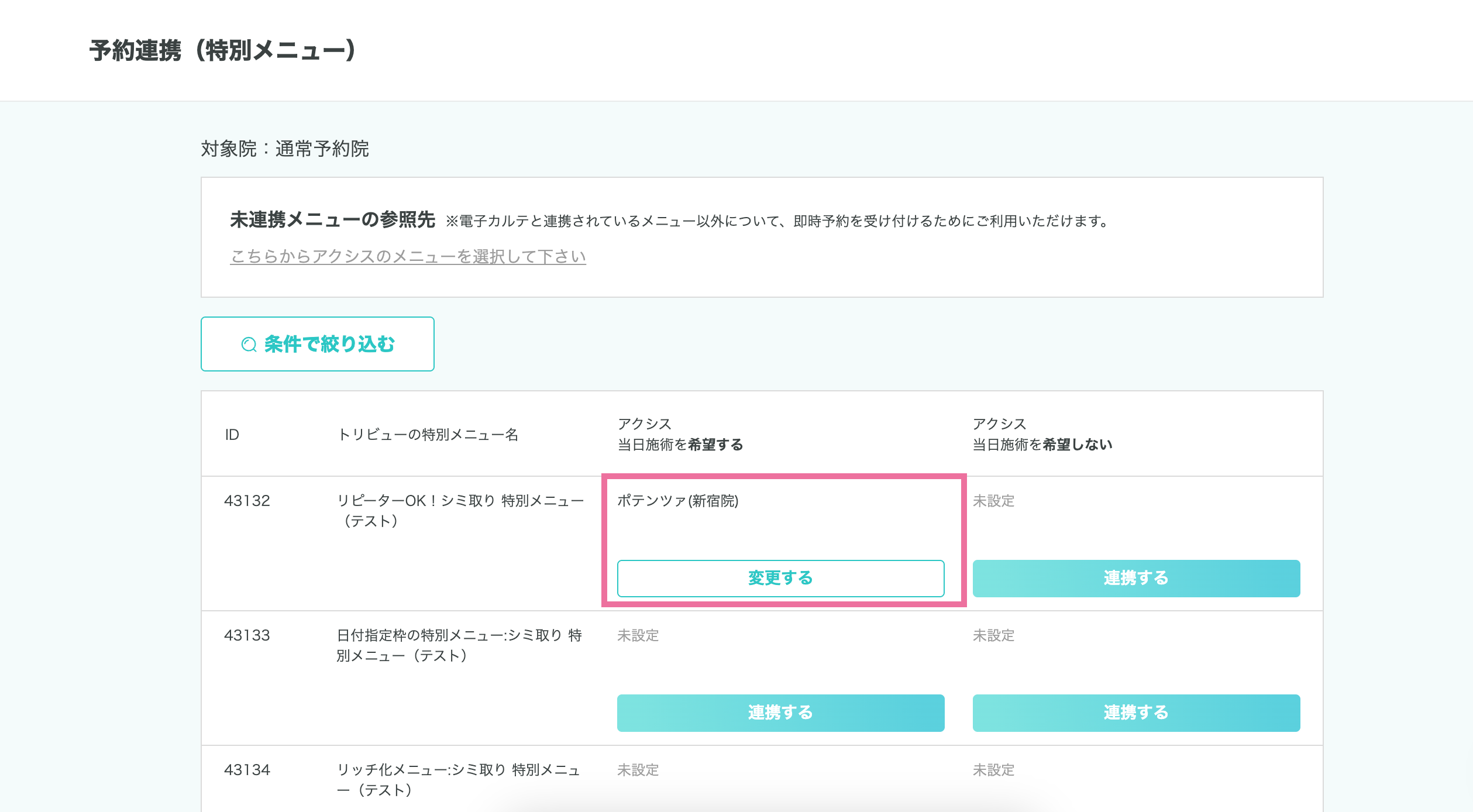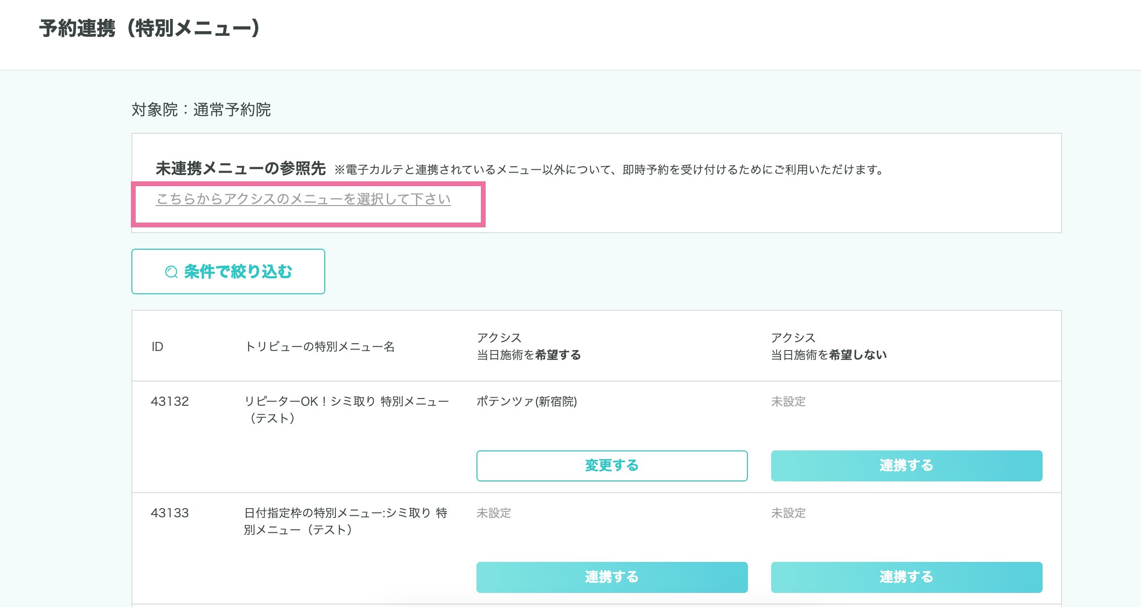 ※該当ページ:予約連携(特別メニュー) or 予約連携(通常メニュー) ➡︎ 院を選択